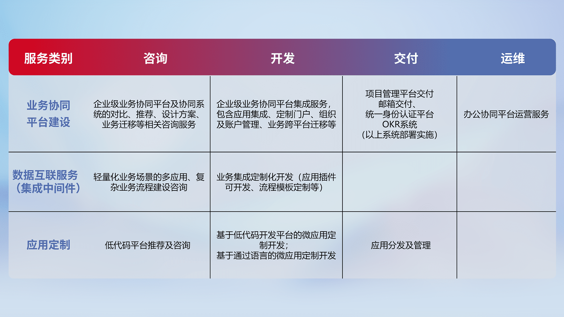 针对钉钉、、、企微、、、、IDaas等平台级产品提供产品的规划、、方案、、、、交付、、、、定制化开发等服务,,实现如统一协同办公、、智能客户服务、、、、混合会议管理、、、智能数据查询、、、等业务场景,,,实现数字化转型。。。。