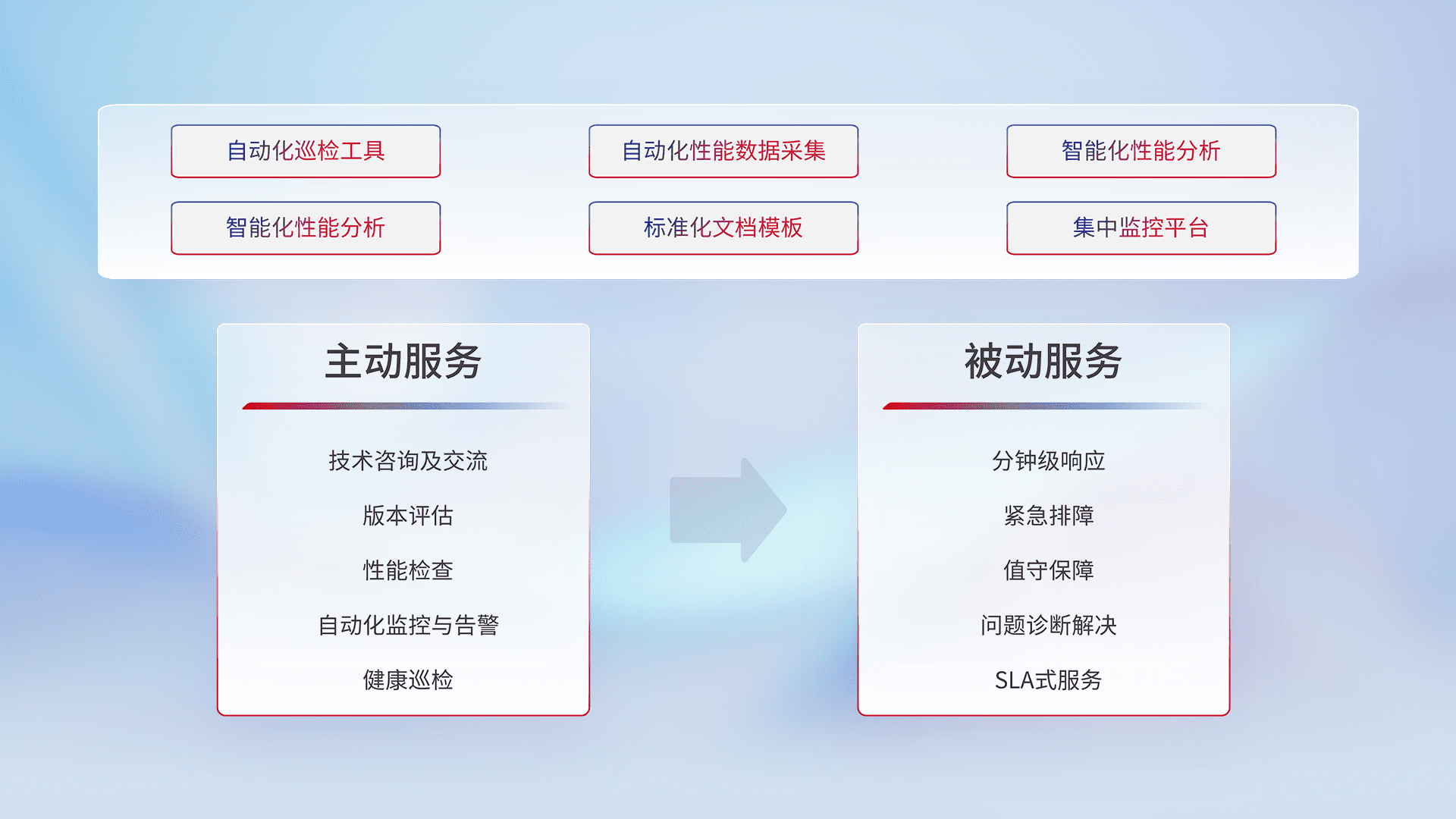 智能化工具和标准化文档,,保障服务质量,,,,提供主动服务(包含技术咨询、、、、版本评估、、、、性能检查、、、、自动化监控与告警、、健康巡检)和被动服务包含(分钟级响应、、、、紧急排障、、、值守保障、、、、问题诊断解决、、SLA服务)。。。